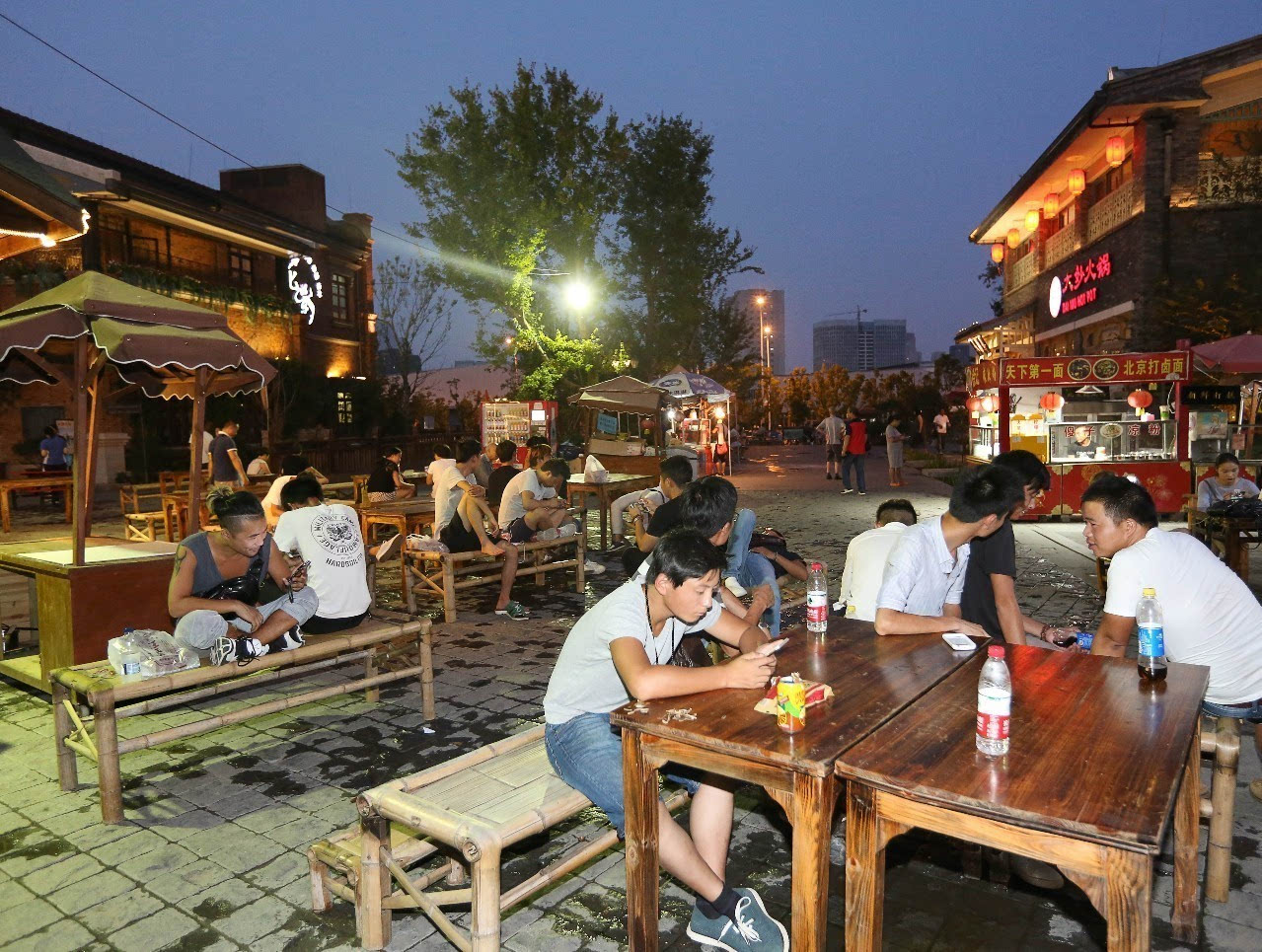 武汉人傍晚在街边洒水后摆上竹床,先用作晚餐的餐桌,以后再当床