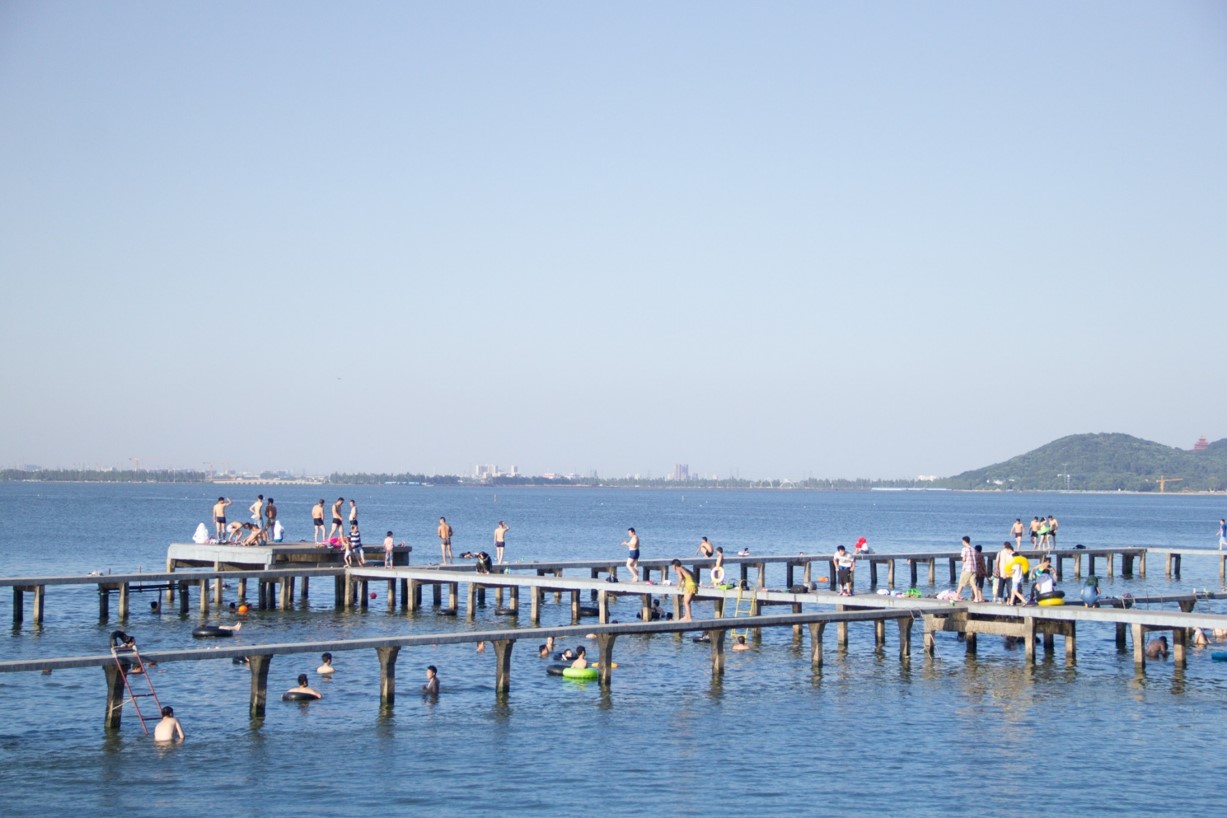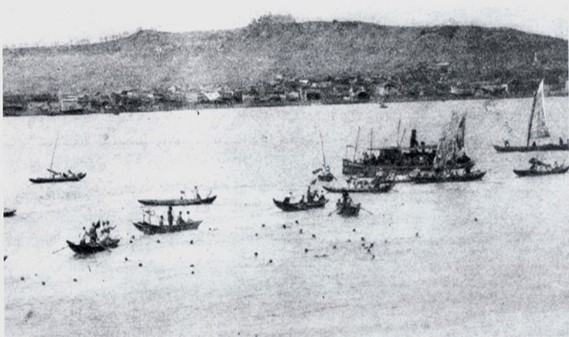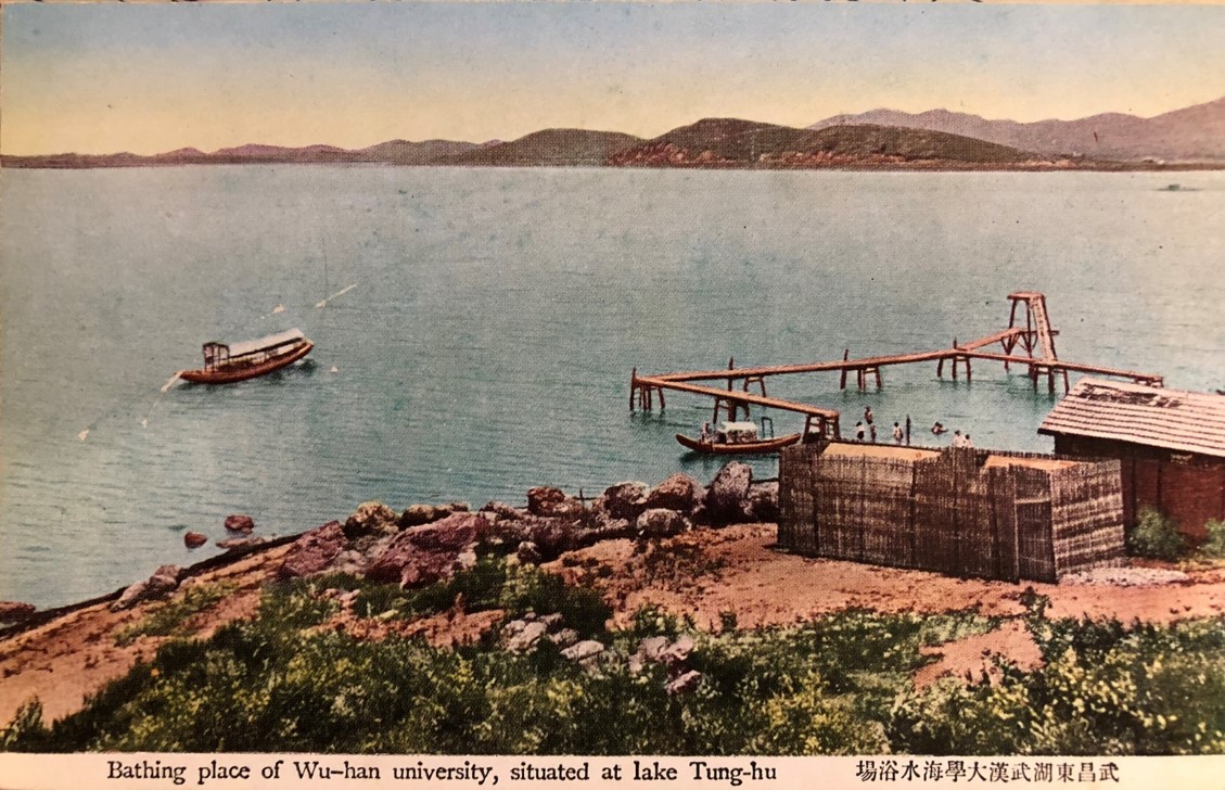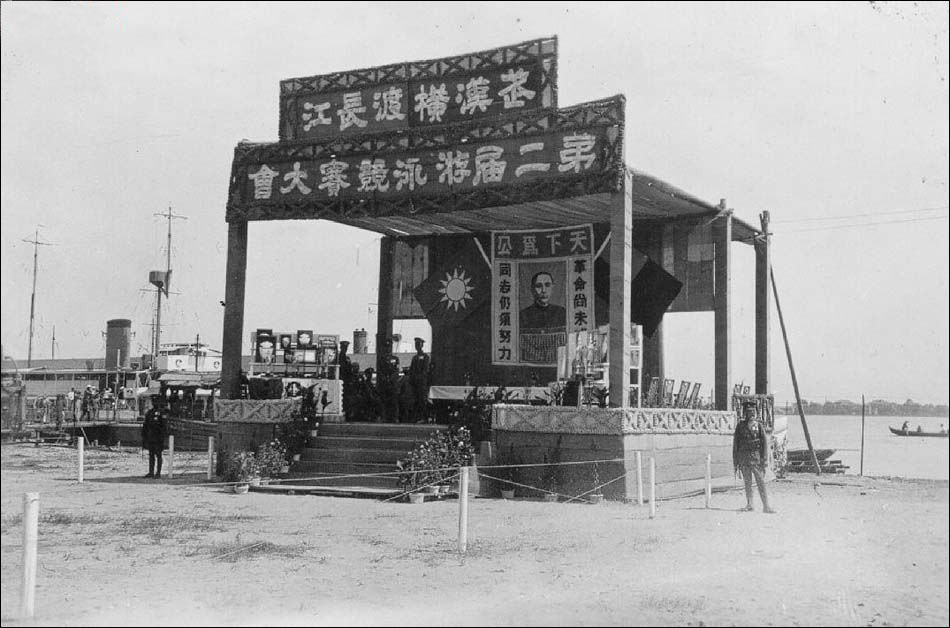 1934年9月9日武汉官方举办首届横渡长江竞赛,全程5000米,有共44人参加横渡,40人到达终点。照片中可见对岸的蛇山。