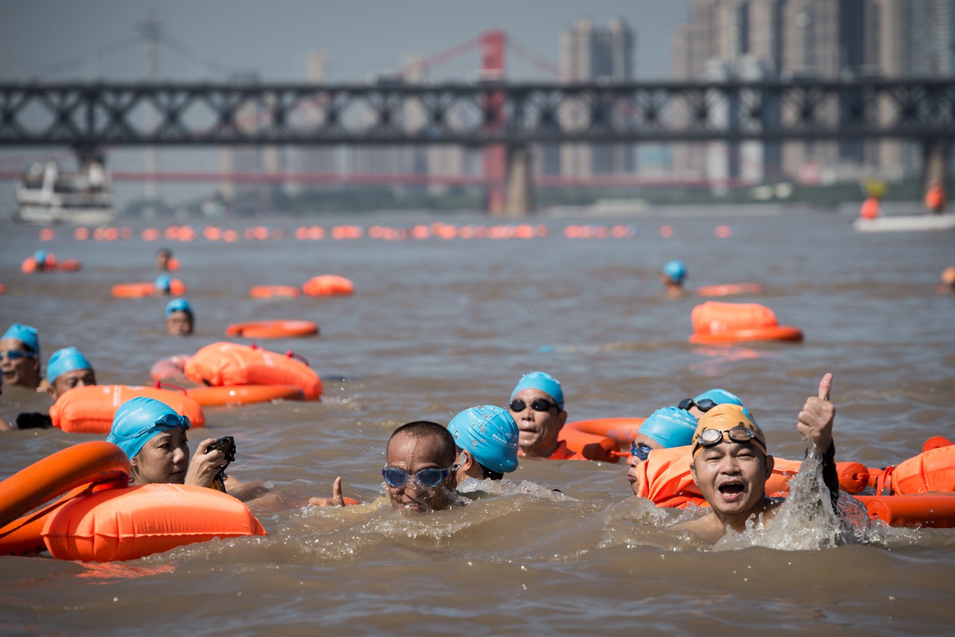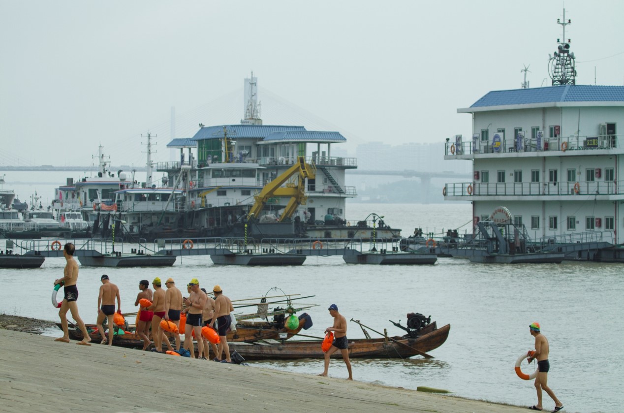 2017年,武汉第43届国际横渡长江活动。带上安全救生设备的参赛者。