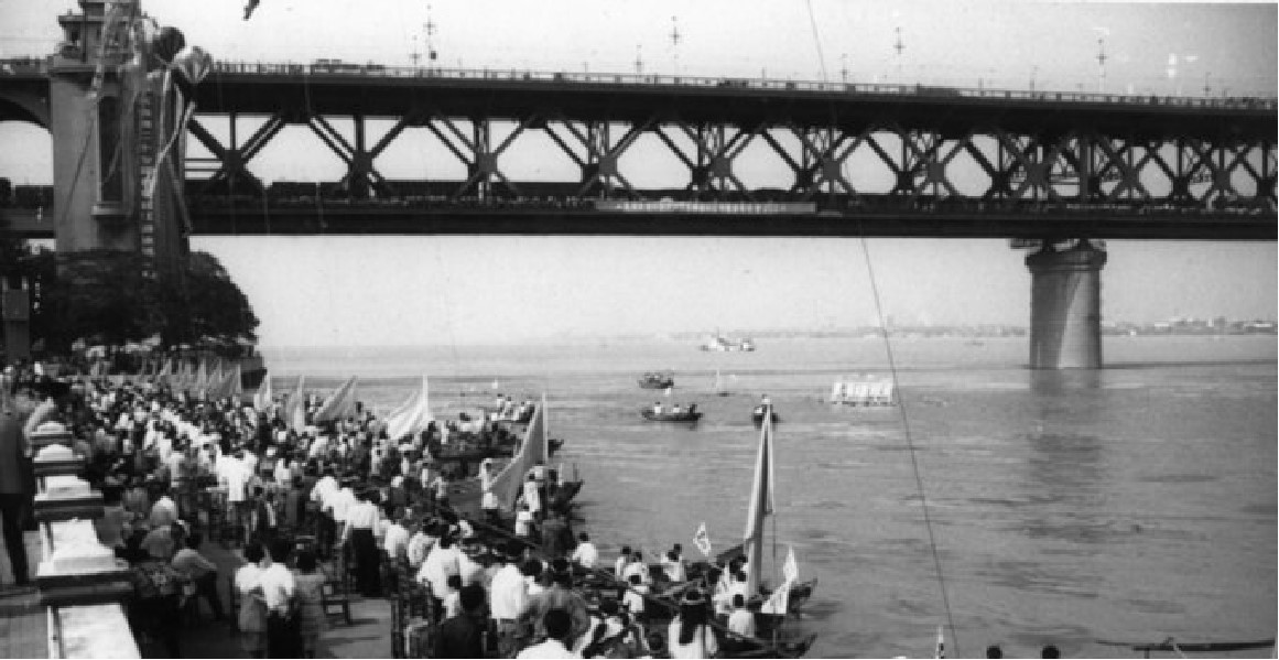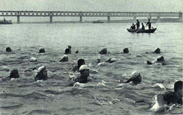 文革期间(1966-1976)的渡江活动常带有一定政治色彩,图为解放军战士携带着武器装备渡江,背景为长江大桥(建成于1957)
