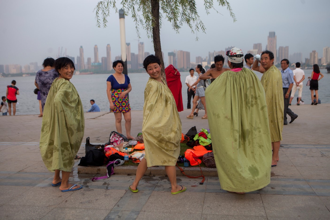 参加江泳的民间团体和个人。女士们在江边用自制的“袍子”罩着进行更衣。